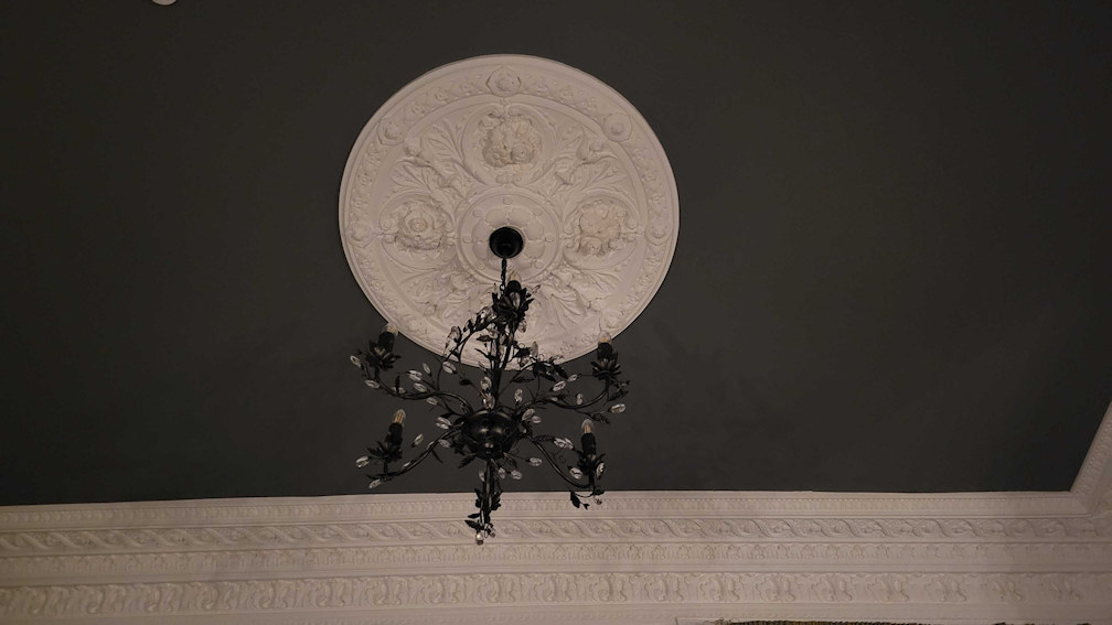 A chandalier in the room and also in the bathroom